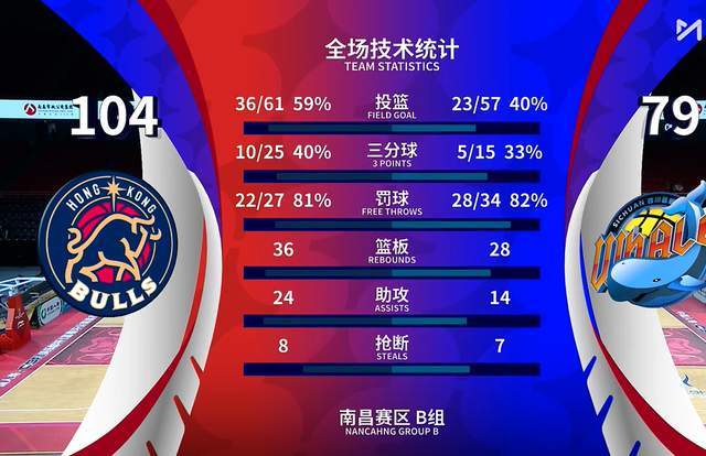到了第四节,香港金牛继续拉大领先,凭借单节20-17,最终,香港金牛以104-79大胜四川男篮。取得二连胜后香港金牛将与同组的上海久事进行下一场比赛,赢球的一方将拿到一个小组出线名额。