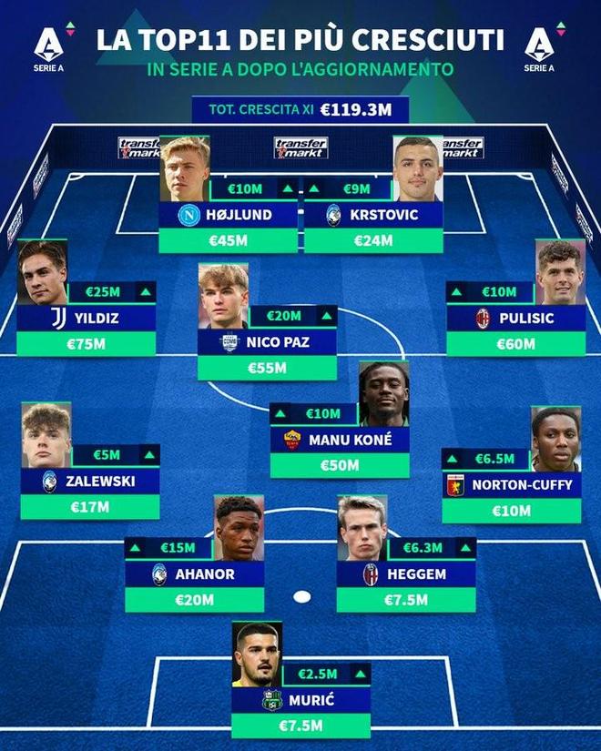普利希奇(AC米兰)6000万欧元(+1000万欧元)、夸迪奥-科内(罗马)5000万欧元(+1000万欧元)、尼科-帕斯(科莫)5500万欧元(+2000万欧元)、凯南-伊尔迪兹(尤文图斯)7500万欧元(+2500万欧元)